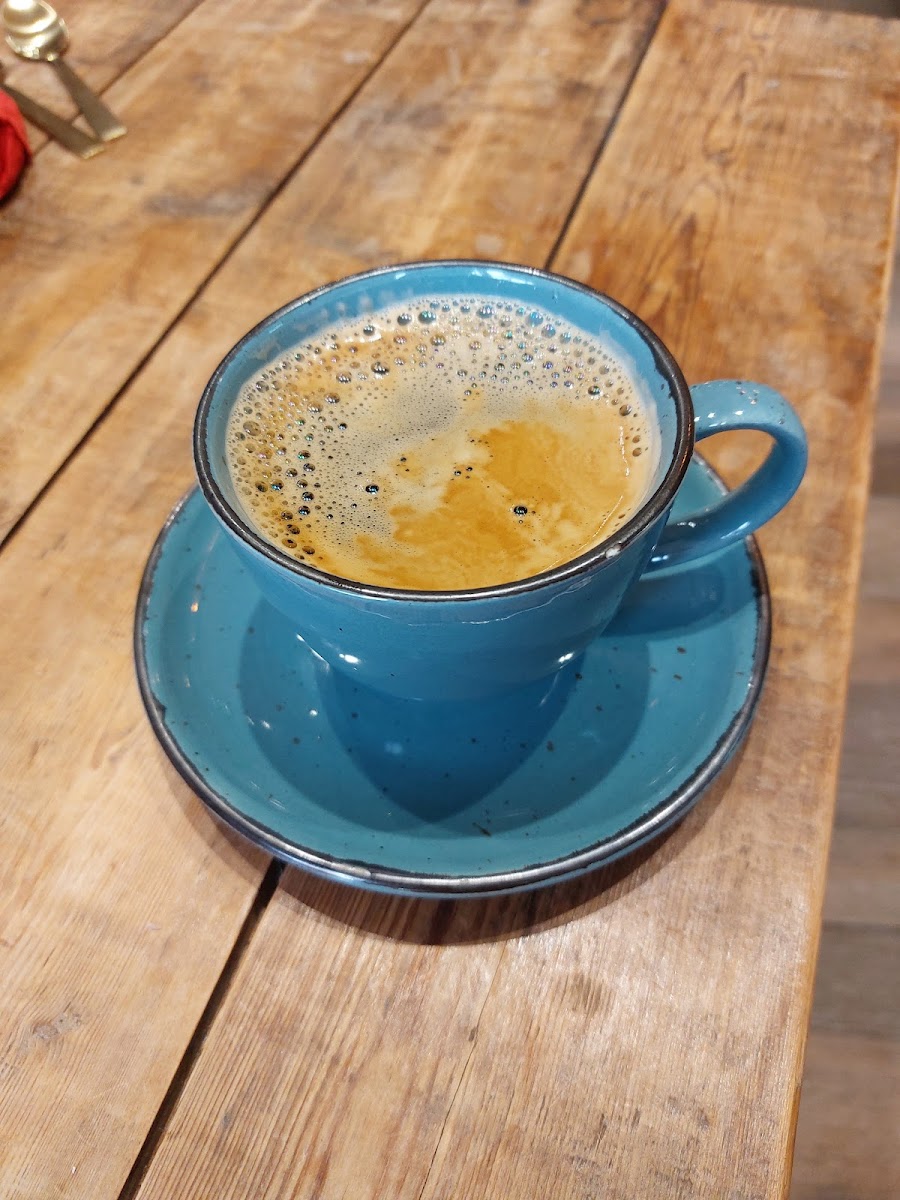 Inside, seating is limited to about ten guests, mixing soft chairs and tall tables that encourage a relaxed, unhurried visit. Upstairs, there is additional space where the cafe continues, which gives a sense of a tucked-away hideaway rather than a high-traffic coffee stop. The shop is often staffed by the resident artist, who works on paintings in a studio area at the back, so visitors can genuinely feel the creative energy behind the walls.